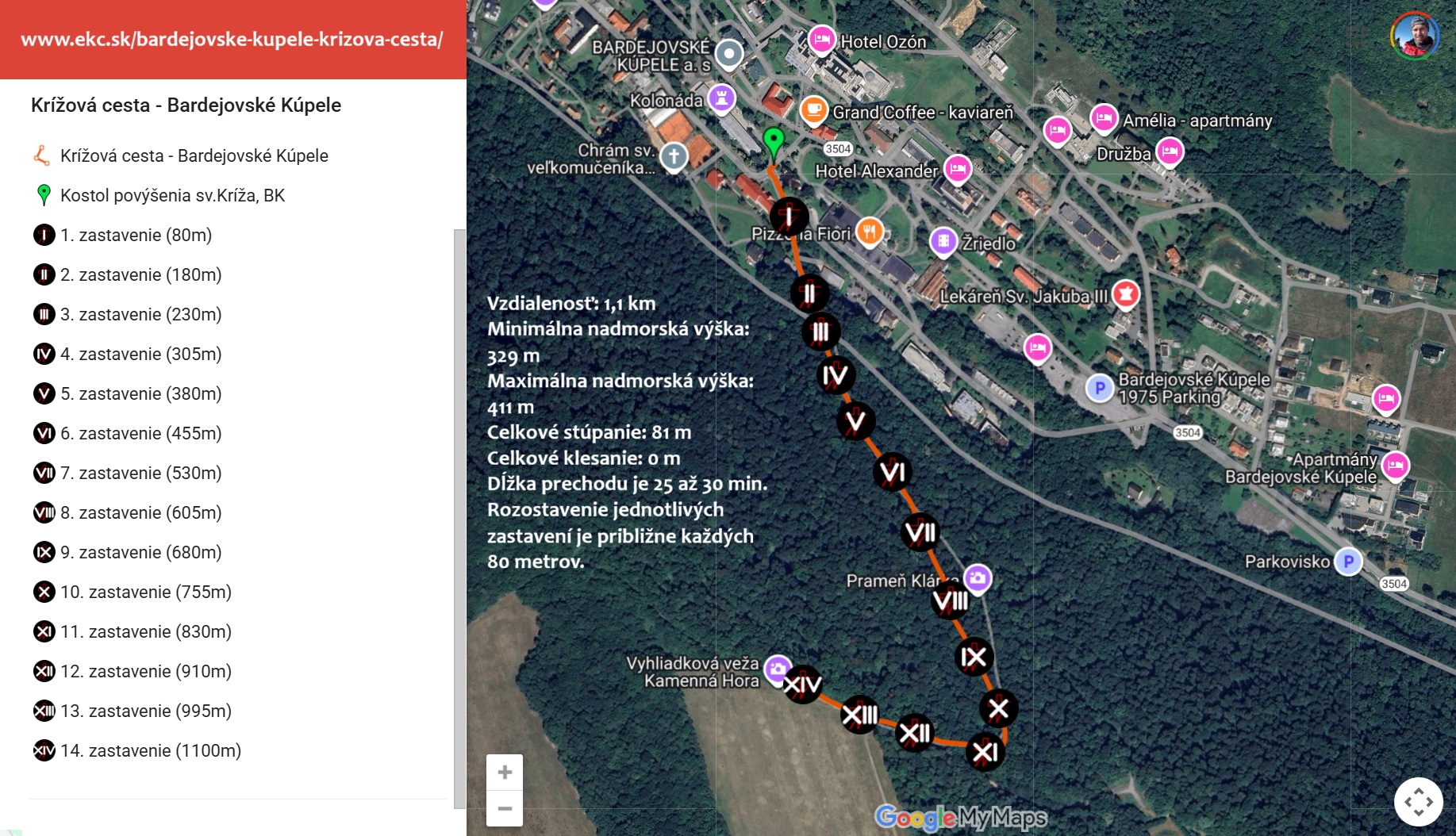 Trasa krížovej cesty v Bardejovských Kúpeľoch začína pri kostole Povýšenia svätého Kríža a pokračuje po červenej turistickej značke až k štrnástemu zastaveniu, ktoré sa nachádza na pri rozhľadni na Kamennej hore.